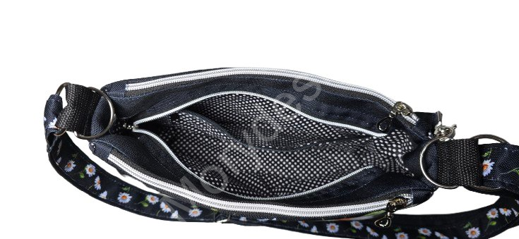 Kabelka je tříkomorová. Má dvě boční komory uzaviratelné na zip + střední komoru uzaviratelnou na zip. Uvnitř má jednu zipovou kapsu.